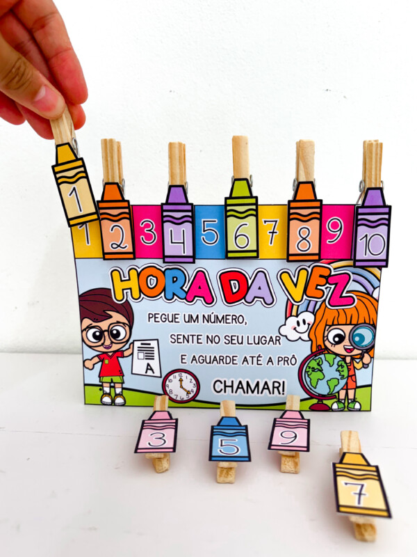 A criança vai até a mesa da prô, retira um prendedor com número,