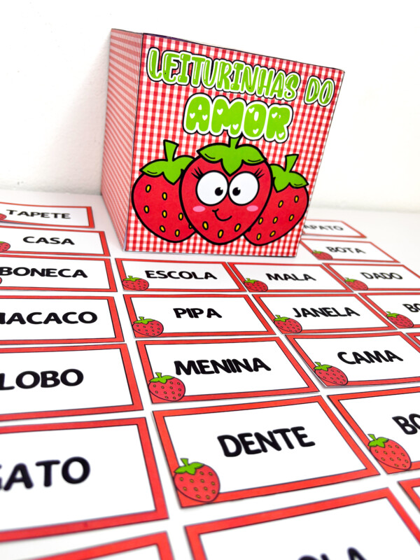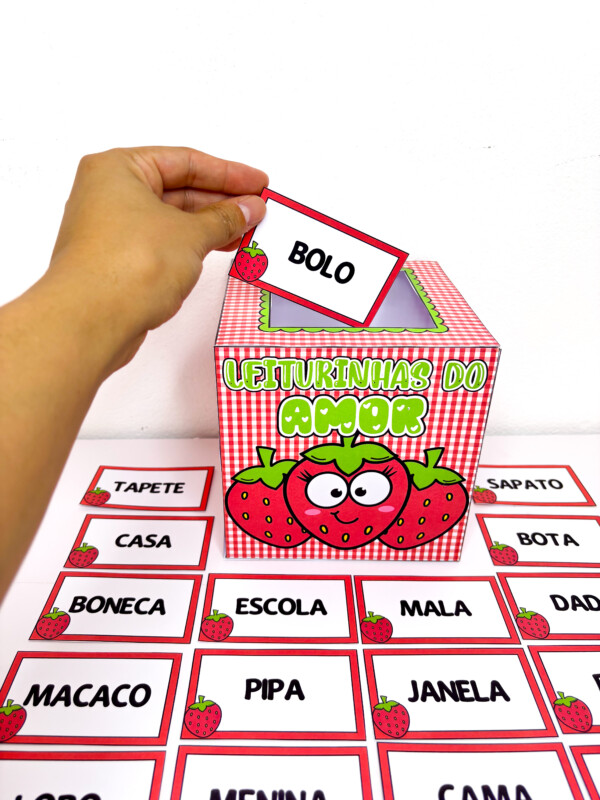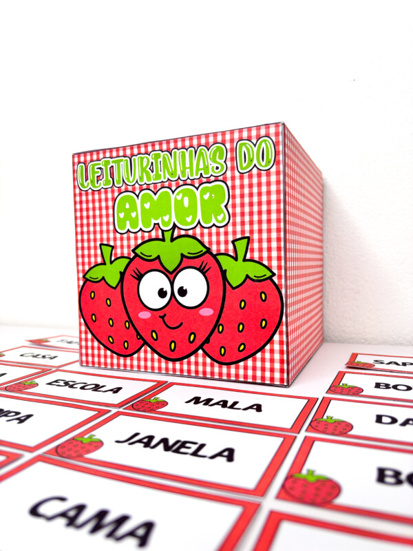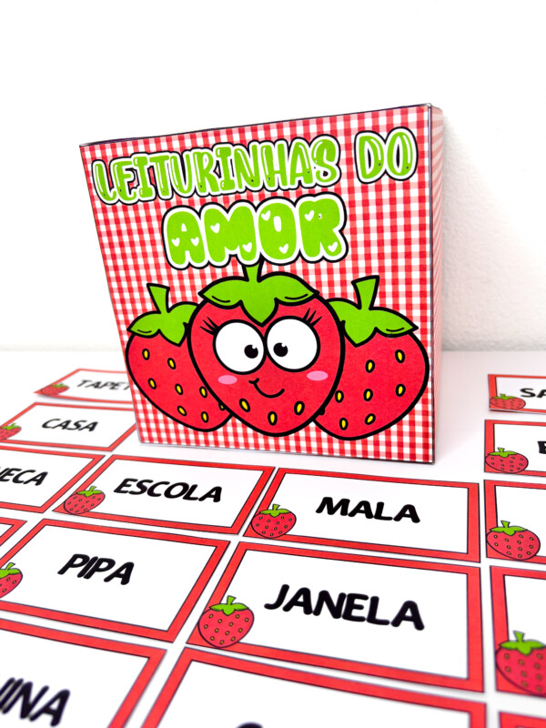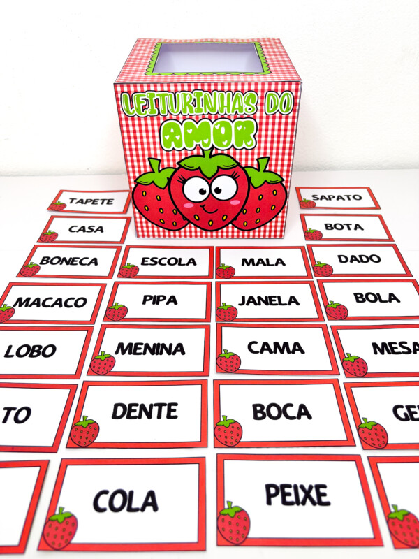 São 54 fichas com palavras, pensadas com carinho para quem está no comecinho da leitura. Tudo isso dentro de uma caixa temática encantadora que combina com a febre do momento: o Morango do Amor!