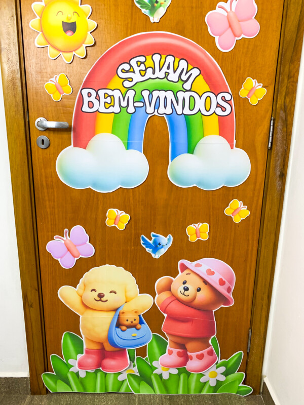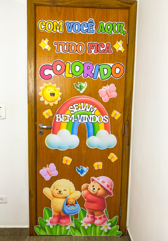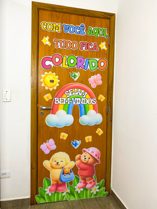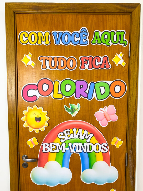 Este painel de porta com o tema Bobbie Goods foi pensado exatamente para isso: criar um cantinho especial logo na entrada da sala, com a frase que diz tudo: “Com você aqui, tudo fica colorido!”